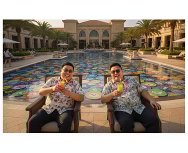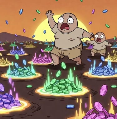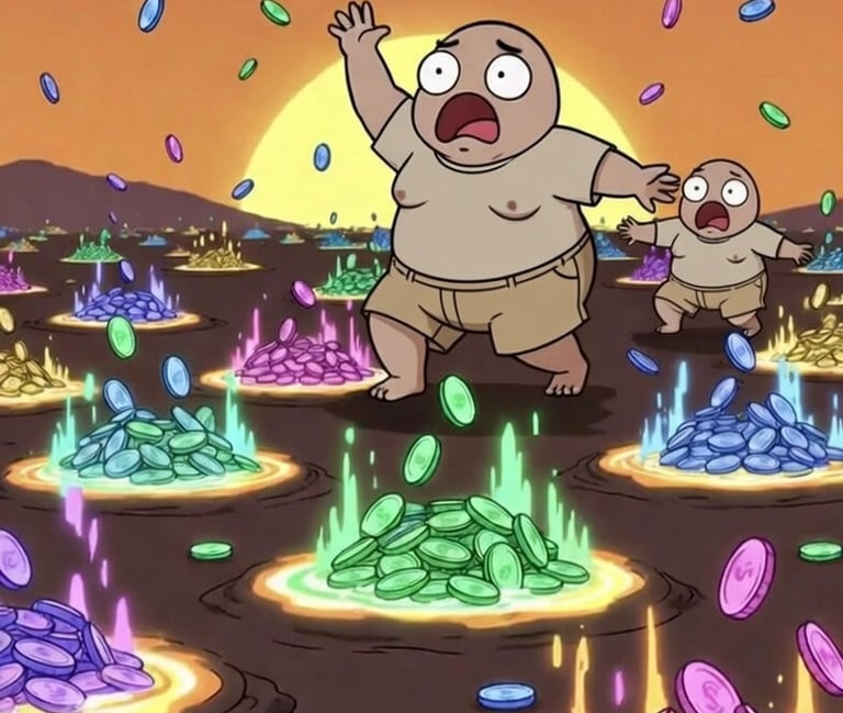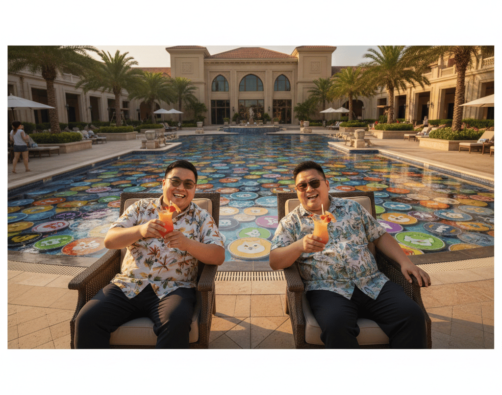 可爱胖胖的家伙们在黎明时分,周围环绕着充满模因币的流动性池。